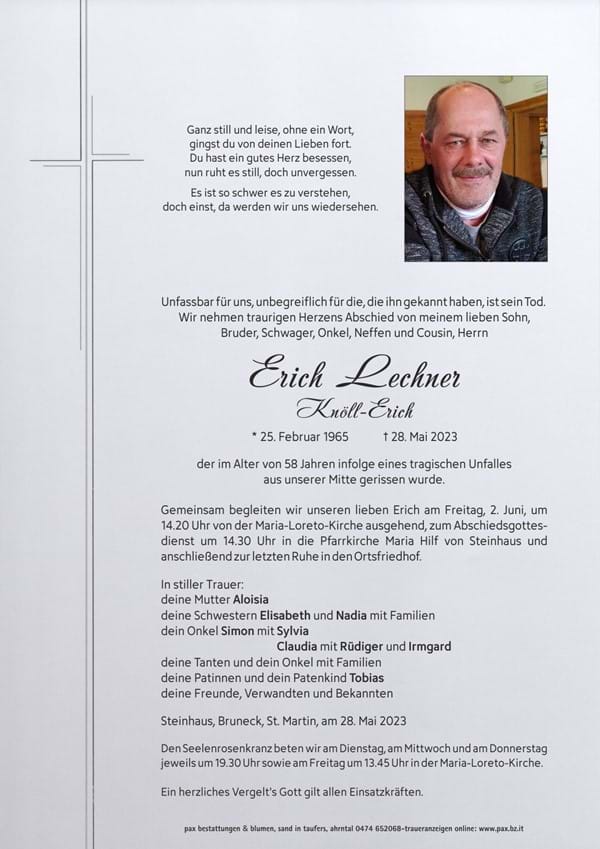 "Aus dem Leben bist du uns genommen-aber nicht aus unseren Herzen..."-Erich du bisch ollm söffl a gimietlicho und feido Memsch giwesn...güita Hoamroase und s ewige Liecht sötto Ollm leichtn...do gonzn Fomilie fa tiefschtn Heschzn mei Aufrichtigis Beileid...🌹