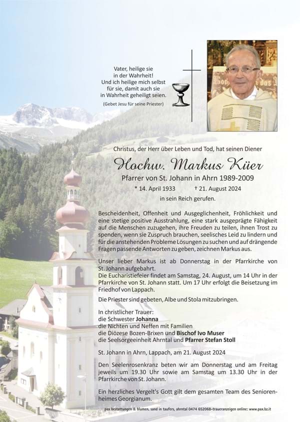 Lieber Pfarrer Markus , viele Jahre bist Du an den Herz - Jesu - Freitagen bei meiner Mamme vorbei gekommen und dafür danke ich Dir recht herzlich. Hast oft ihre schönen Blumen rund ums Haus bewundert und hast ihr damit eine große Freude gemacht. Die 3 großen Steine vor dem Haus , die Form von Bergen... haben wir scherzhaft " die 3 Zinnen " genannt . Was haben wir da gelacht! Liebevolle Worte aus deinem guten Herzen haben aufgebaut und getröstet.... Du warst ein wundervoller Mensch!! Mit Tränen in den Augen lassen wir dich schweren Herzens gehen . Pfiet Gött , lieber Pfarrer Markus. Chöre der Engel mögen Dich auf deinen letzten Weg begleiten und auf eine wundervoll blűhende Blumenwiese betten, die NIE verblüht!!! In stiller Trauer und großer Dankbarkeit