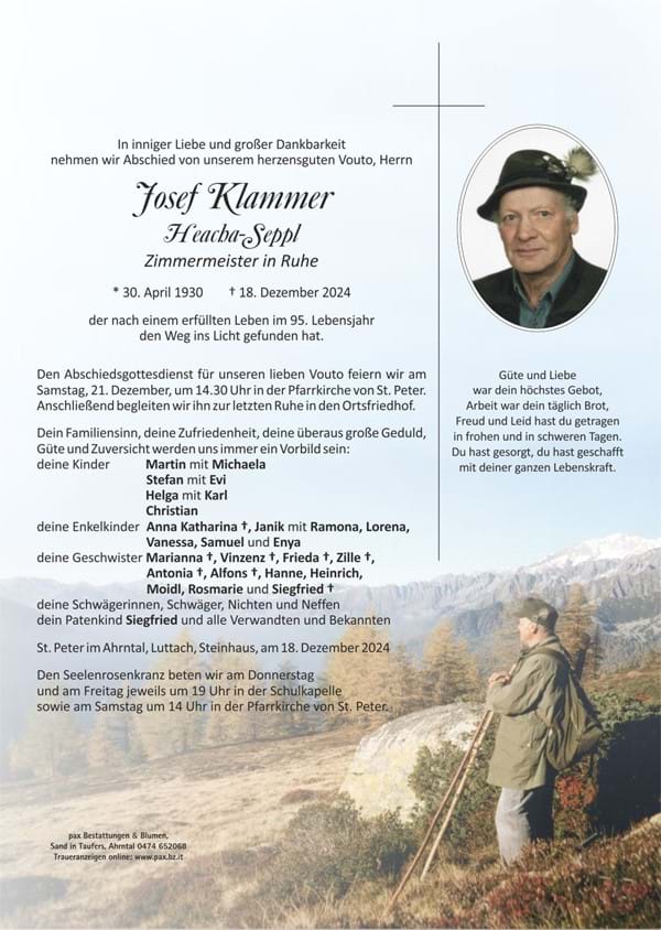 Auf die Neujahrschreier hast du dich immer ganz besonders gefreut. So hast du, lieber Seppl, schon um 6 Uhr morgens darauf gewartet ihre Glückwünsche entgegenzunehmen und ihnen ebenfalls alles Gute für das Neue Jahr zu wünschen. So wie sich das Jahr im Winter zu Ende neigt, um wieder zu einem neuen Jahr zu beginnen, so hast auch du dein Leben kurz vor Weihnachten dem Schöpfer zurückgegeben um an einenm anderen Ort zu einem neuen Leben zu erwachen. Jetzt bist du wieder mit deiner Frau und deiner Enkelin vereint. Lieber Seppl ruhe in Frieden. Der gesamten Trauerfamilie, besonders aber Helga, Christian und Karl, aufrichtige Anteilnahme