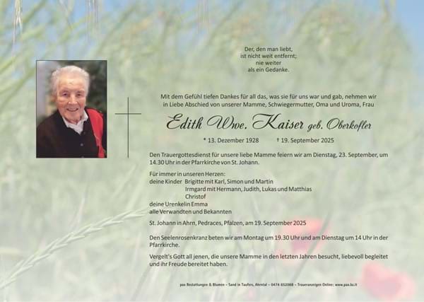 Auferstehung ist unser Glaube, Wiedersehen unsere Hoffnung, Gedenken unsere Liebe. Ruhe in Frieden Edith!