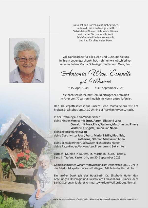 Von guten Mächten wunderbar geborgen erwarten wir getrost was kommen mag ...wor olbm nett wennwo ins bigegnt san ,appou wöüscht mit dio zi reidn..Antonia ruhe in Friedn.. .Herzliches Beileid der Trauerfamilie