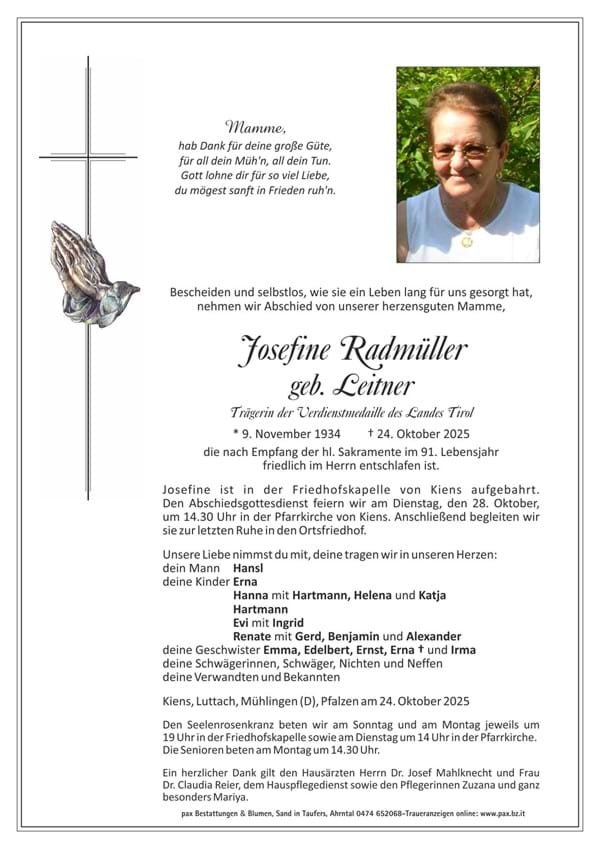 Liebe Hanna mit Familie......Es isch net leicht,die richtign Worte zi findn dei helfn ,die Trauer zi ibowindn.Obo nouch do Trauer kimp mit do Zeit s'storke Gfühl do Donkborkeit.A longs Lebm wor deido Mama beschiedn,drum dorf sie itz roschtn vo olbm in Friedn..Inso aufrichtigis Beileid in dea schwern Zeit Sandra Niederkofler mit Familie