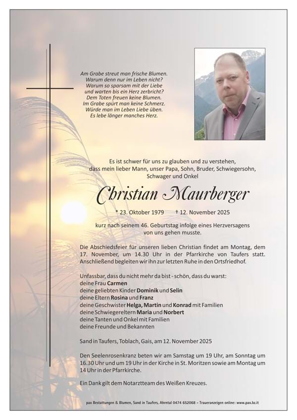 Liebe Trauerfamilie Trennung ist unser Los, Wiedersehen unsere Hoffnung. So bitter der Tod ist, die Liebe vermag er nicht zu scheiden. Aus dem Leben ist er zwar geschieden, aber nicht aus unserem Leben; denn wie vermöchten wir ihn tot zu wähnen, der so lebendig unserem Herzen innewohnt! Liebe Gattin Carmen mit Selin, Eltern Rosa und Franz, Geschwister und Angehörige ich wünsche euch viel Kraft diesen so unerwarteten Verlust eures Christian mit der Hilfe Gottes Anzunehmen Mein Aufrichtiges Mitgefühl möchte ich euch auf diesem weg aussprechen.