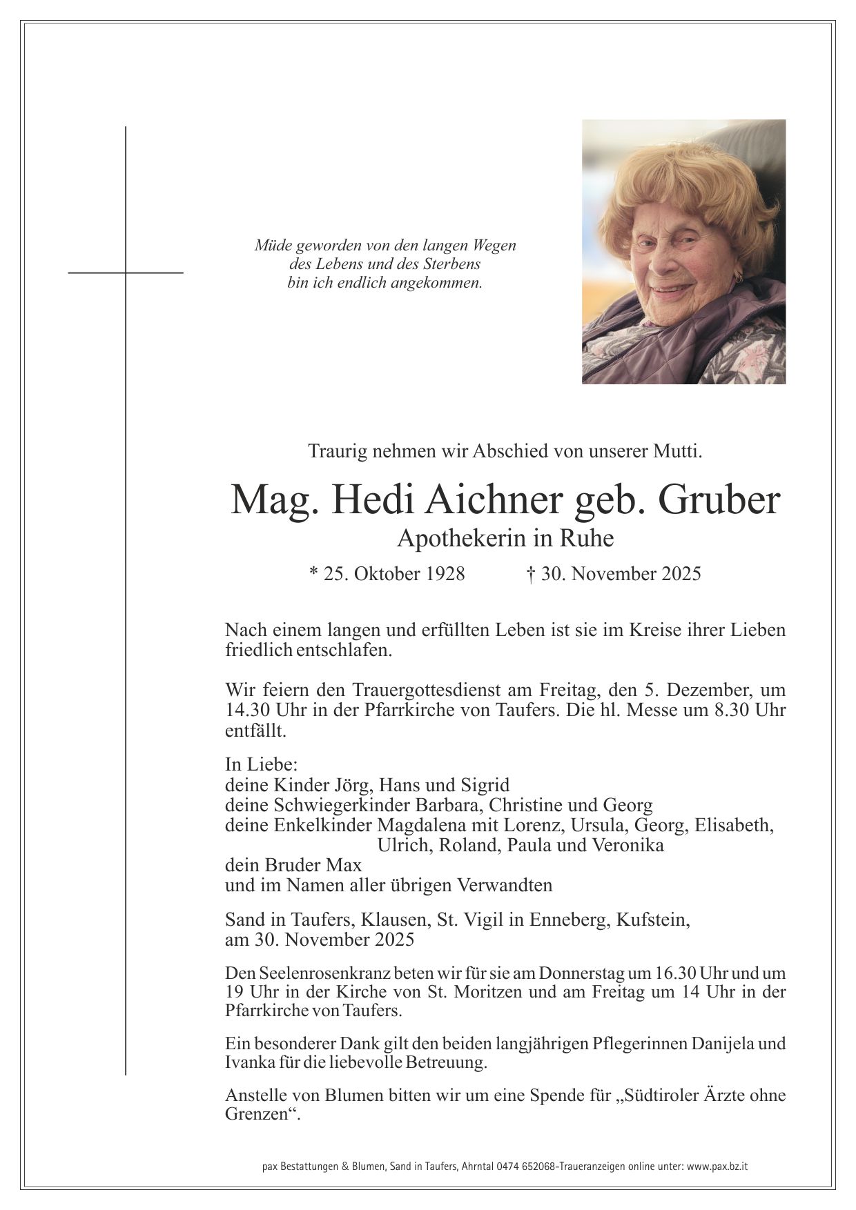Ich glaube, dass wenn der Tod unsere Augen schließt, wir in einem Licht stehen, von welchem unser Sonnenlicht nur der Schatten ist. (Arthur Schopenhauen) Liebe Frau Aichner, mit Freude denken wir an unsere letzten Begegnungen bei Ihnen zu Hause zurück. Vor allem das Kufsteinlied hinterlässt nun besondere Erinnerungen. Lieber Hans&Christine mit Familie, Liebe Trauerfamilien, herzliche Anteilnahme zum Tod eurer lieben Hedi. Möge sie sich nun in Gottes ewiger Freude geborgen wissen.