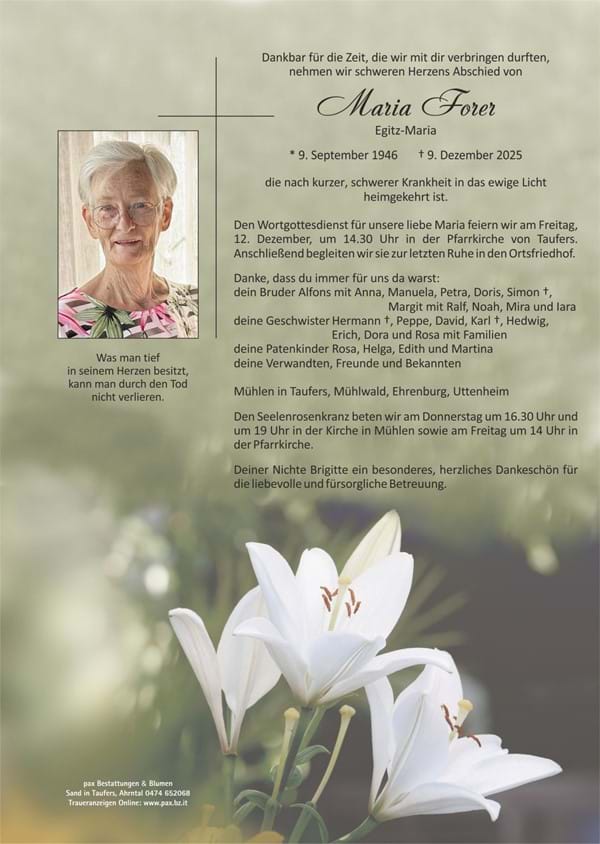 Liebe Maria danke für die Besuche im Geschäft! Es wor immer nett mit dir zu reden!! Worsch so a feina und zufriedene Frau! Ruhe in Gottes Frieden! Allen Trauerfamilien unser tiefes Mitgefühl!
