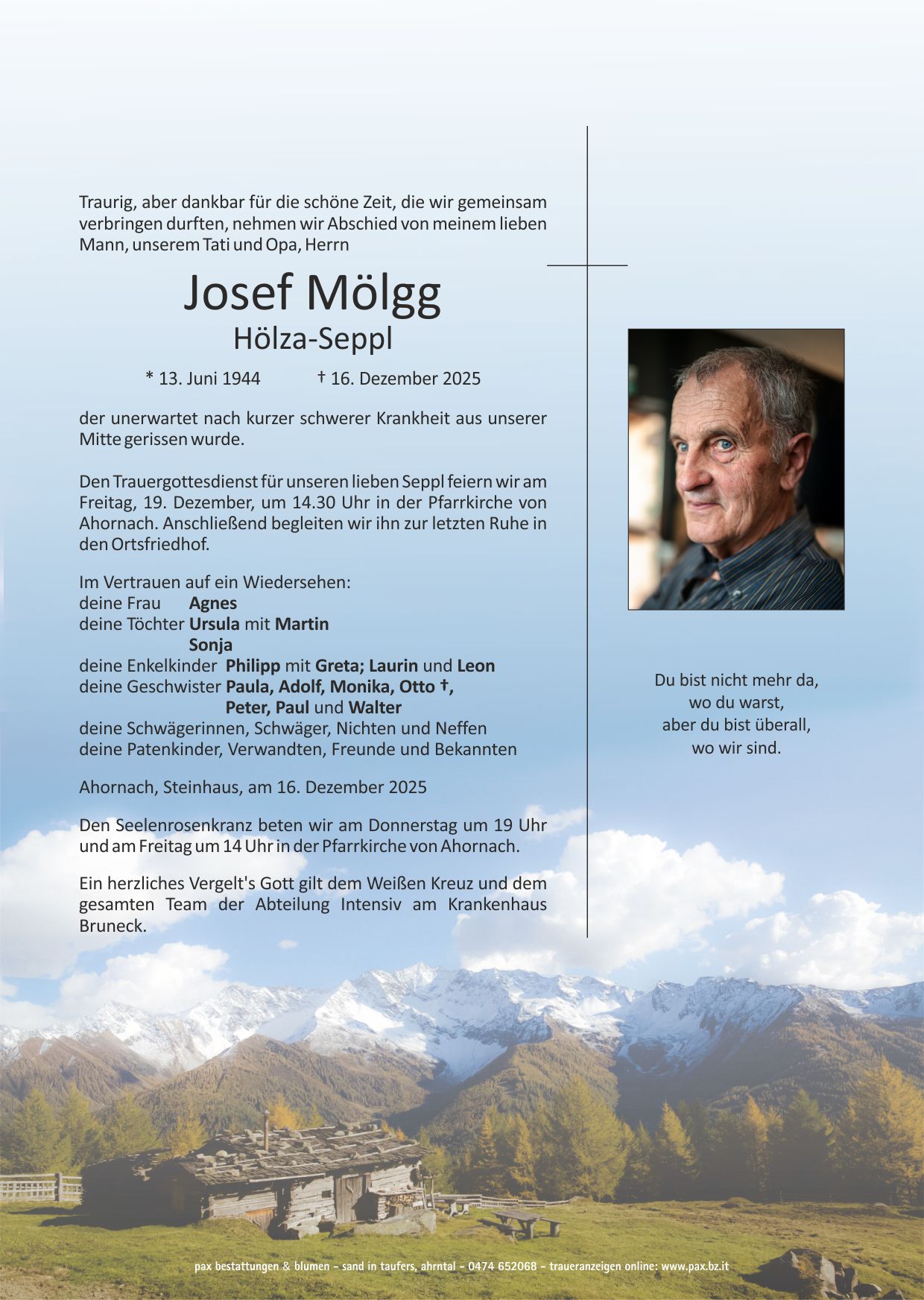 Herzliches Beileid euch, Agnes, Ursula, Sonja und der ganzen Familie Mölgg. Seppl, ruhe in Frieden.🥀