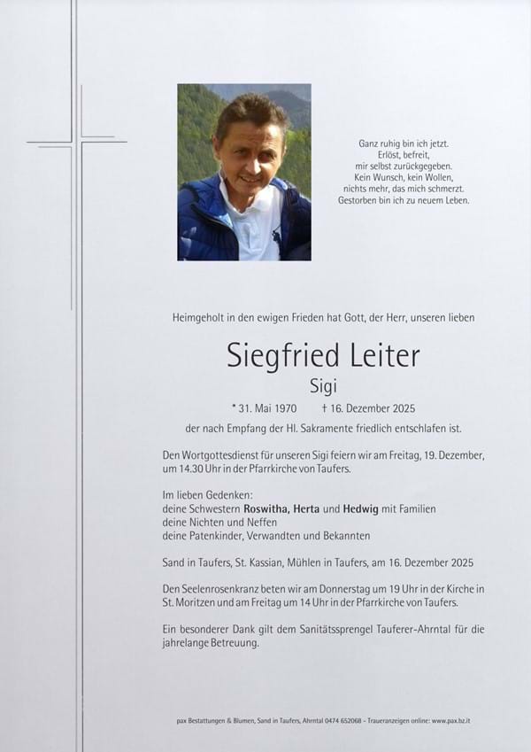 Liebe Schwestern Roswitha,Herta und Hedwig mit Familien,mein aufrichtiges Beileid zum allzu frühen Verlust eures Bruders Siegi drücke ich euch mein aufrichtiges Beileid aus und wünsche viel Kraft,Trost und Zuversicht zum allzu frühen Verlust eures Bruders Siegi,sowie viele Menschen,die euch nun in dieser schweren kommenden Zeit begleiten,für euch da sind und Halt und Stütze sind.Die Menschen,die von uns gehen und die wir lieben,verschwinden nicht.Sie sind immer an unserer aller Seite....Jeden Tag....ungesehen....ungehört und dennoch immer ganz nah bei uns.Für immer geliebt und für immer vermisst,bleiben sie für immer in unseren aller Herzen auch wenn wir sie loslassen müssen.