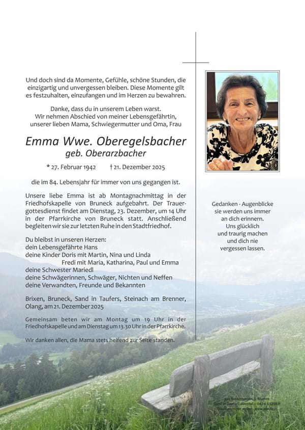 Liebe Emma ruhe in Frieden ,herzliches Beileit der Familie,ich habe dich im Juni 2023 im Brixner Krankenhaus kennengelernt ,wir waren beide im gleichen Zimmer und wir haben uns sehr gut verstanden ,schade dass du jetzt schon gehen musstest ,liebe Emma Ruhe in Frieden .