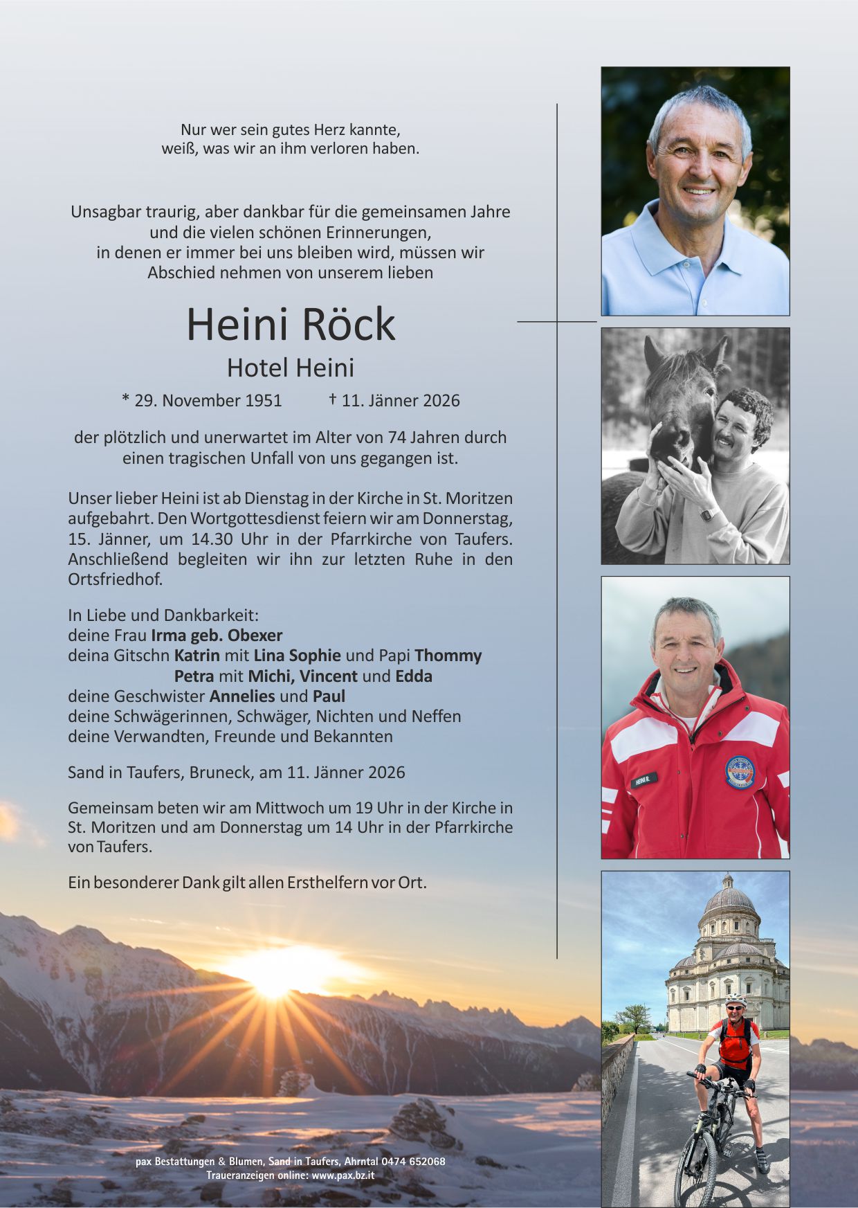 Schwer begreiflich ist dein plötzlicher Abschied, lieber Heini. Ich bin dankbar für die vielen gemeinsamen Jahre am Speikboden und werde dich stets in guter Erinnerung behalten. Ruhe in Frieden. Der Familie wünsche ich viel Kraft und Zuversicht in dieser schweren Zeit. Skilehrerkollege Artur Kirchler