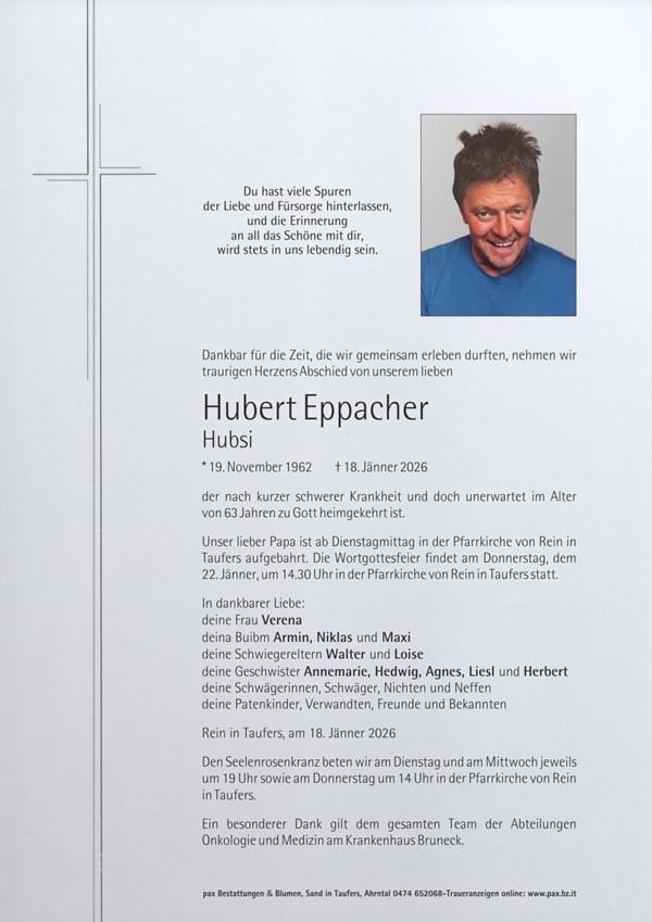 A Kerzl soll dir ewig leuchtn! Hubert ruhe in Gottes Frieden und beschütze Verena und die Büibn!! Es wor immer nett mit dir zi redn!! Unser herzliches Beileid und viel Kroft in der so schwarn Zeit!