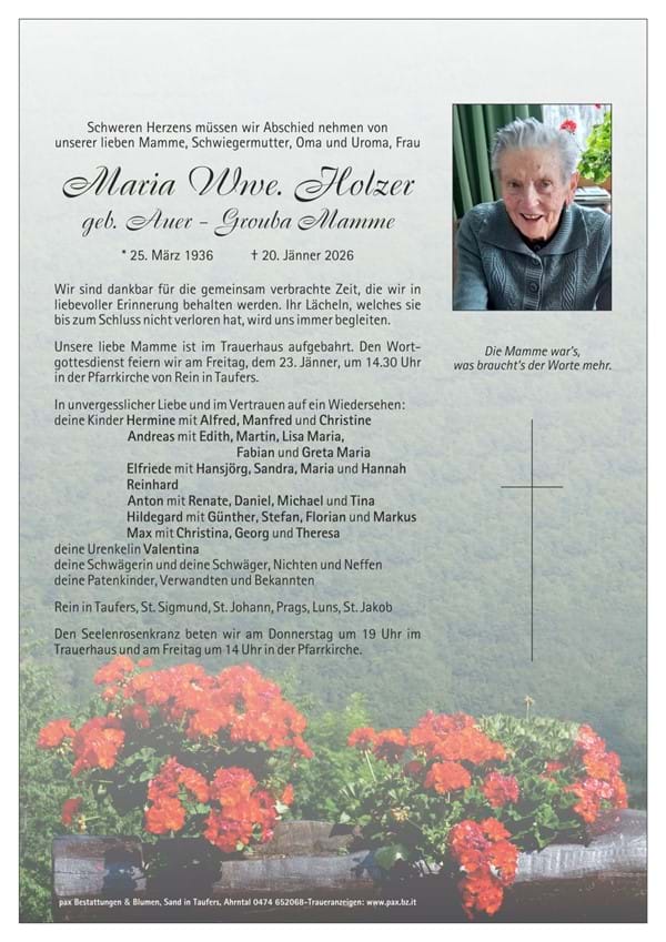 Liebe trauernde Geschwister Holzer mit Familien. Es ist die Zeit gekommen die müden, fleissigen Hände loszulassen-doch in Gedanken niemals die geliebte Mutter. Durch meine Schwägerin Maria blieb ich und meine Fam. immer mit Stück Heimat verbunden. Wir wurden bei jedem Besuch in Rein sehr herzlich von ihr empfangen. Wir haben das sehr geschätzt. Danke Maria. Sie war eine wunderbare, einzigartige Frau. Gott gebe ihr die ewige Ruhe, möge sie ruhen in Frieden. Da wir leider am Freitag nicht am Gottesdienst teilnehmen können werden wir daheim eine Kerze anzünden und in Gedanken bei euch sein. Euch allen sprechen wir unser tief empfundenes Beileid aus. Mit stillem Gruss