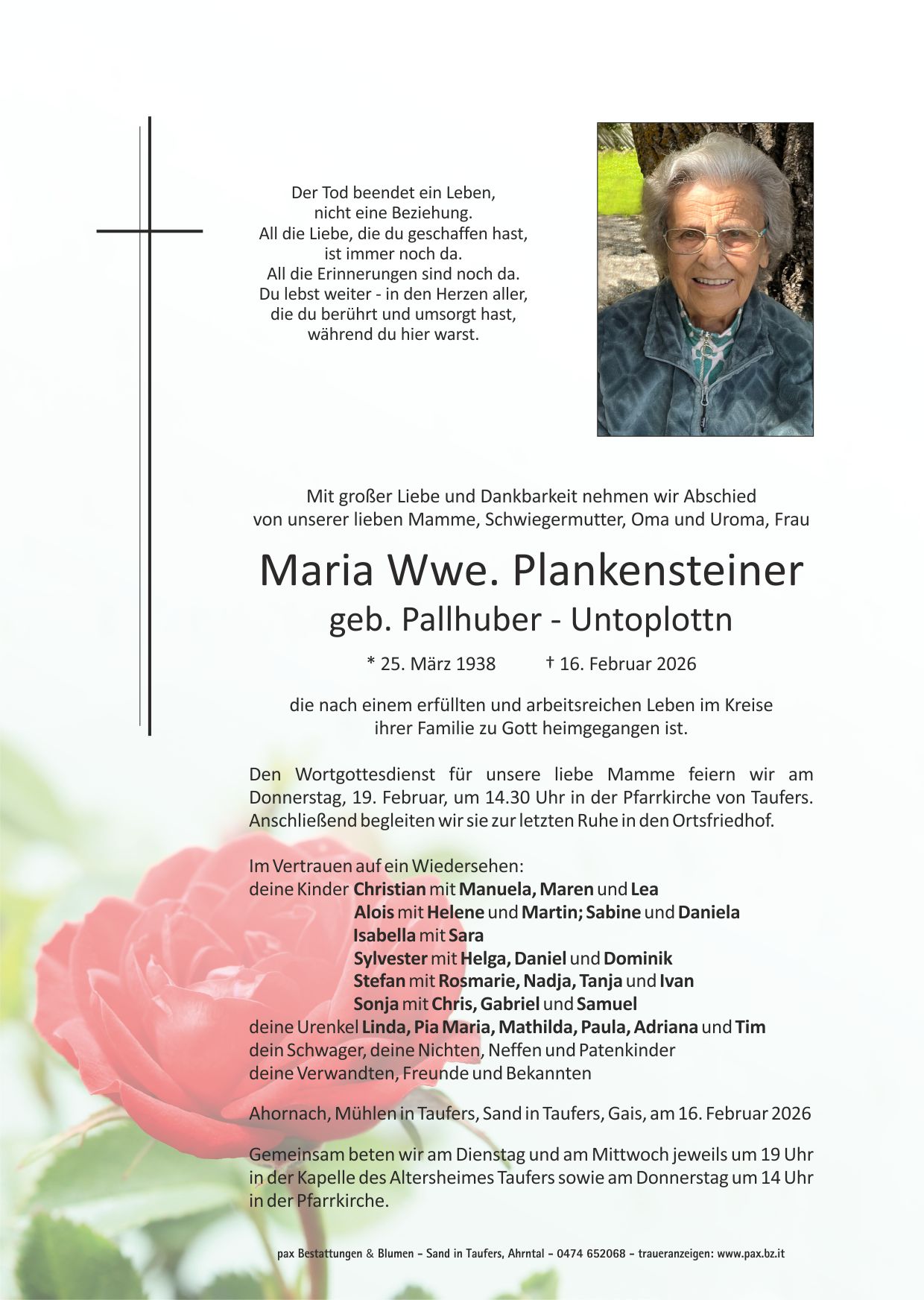 Maria, ruhe in Frieden. A Kerzl sölldo leichtn! Suichdo a feins Platzl dou öbm und schaug fest oacha af deina Lieben, Beileid do gonzn Trauerfamilie und viel Kraft 🌹🕯