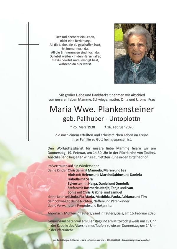 Wir werden Eure Mutter als eine liebenswerte, freundliche Frau in guter Erinnerung behalten. Unsere Anteilnahme Antonia, Arnold, Silvia und Janis Seeber