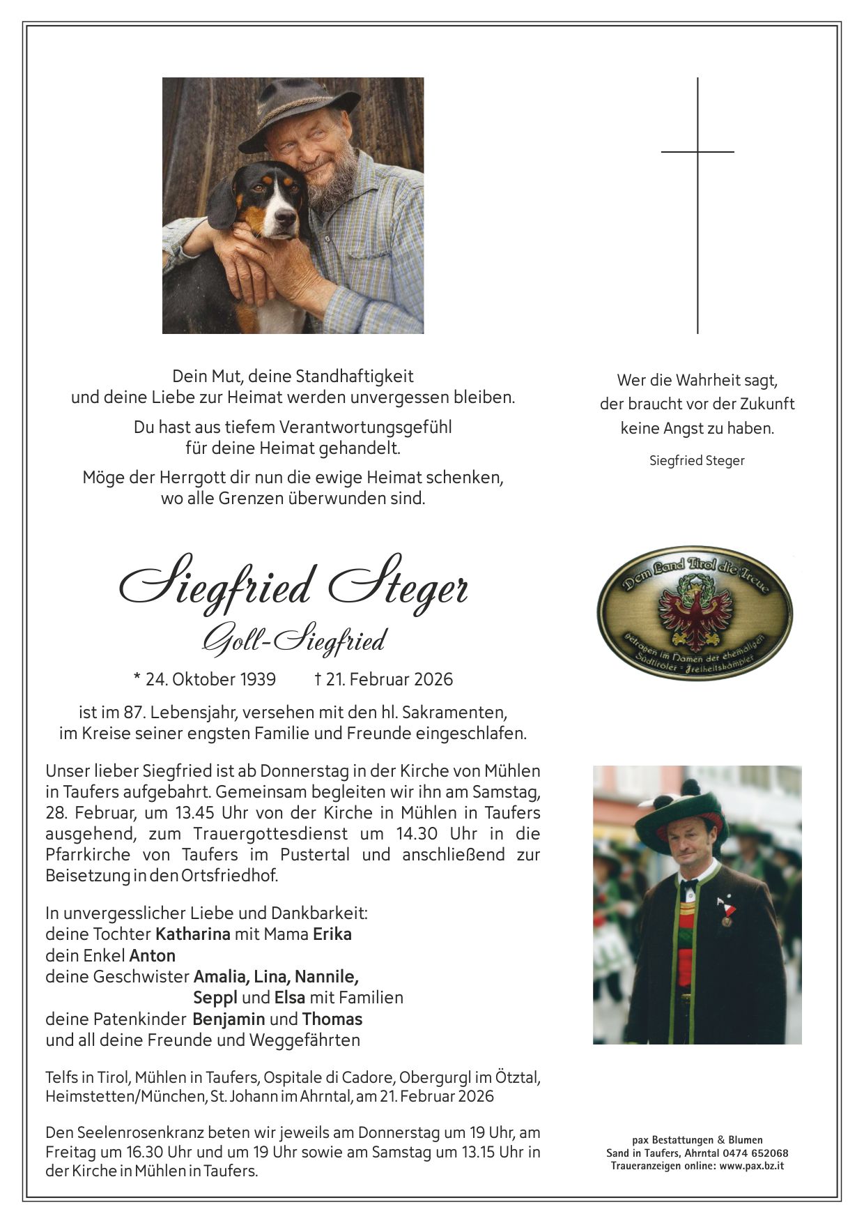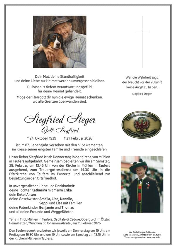In stillem Gedenken an unseren Kameraden Siegfried Steger Werte Trauerfamilie, die Schützenkompanie St. Johann nimmt Abschied von einem aufrechten Tiroler und dem letzten der „Puschtra Buibm“. Siegfried hat für seine Heimat Opfer gebracht, die wir niemals vergessen werden. Auch wenn ihn die Grenzen lange trennten, blieb er im Herzen stets ein Teil unserer Gemeinschaft und seiner Ahrntaler Berge. Wir verneigen uns vor seiner Lebensleistung und seiner Treue zum Vaterland. Unser aufrichtiges Mitgefühl gilt der gesamten Familie. Schützenkompanie St. Johann i. A.