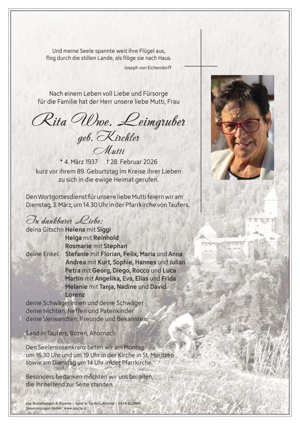 Eine liebe Frau, die immer lieb und gutmütig im Ausdruck war, ist heimgegangen. Gerne erinnere ich mich an die Kindertage, wo wir liebe Worte und nette Gesten, eine Gesichtscreme oder manchmal auch eine Süßigkeit bekamen, wenn wir Kinder vom Oberpurstein ab der Feuerschwende mit Helene, Helga und Rosmarie alle zusammen den Schulweg gingen. Liebe Rita, das schönste Platzl im Himmel neben deinem geliebten Lois, soll für dich bereitstehen. Herzliches Beileid allen, die um Rita trauern.