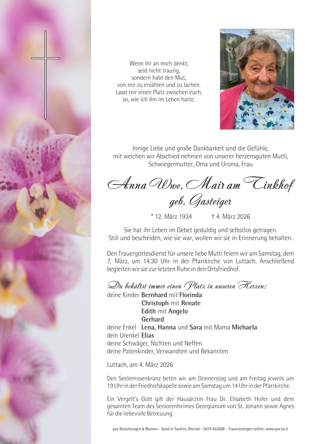 Wenn sich der Mutter Augen schließen und ihr Herz im Tode bricht, dann ist das schönste Band zerrissen, ein Mutterherz ersetzt man nicht. Aufrichtige Anteilnahme am Tod Wurzer Mutte. Ruhe in Frieden Anna.