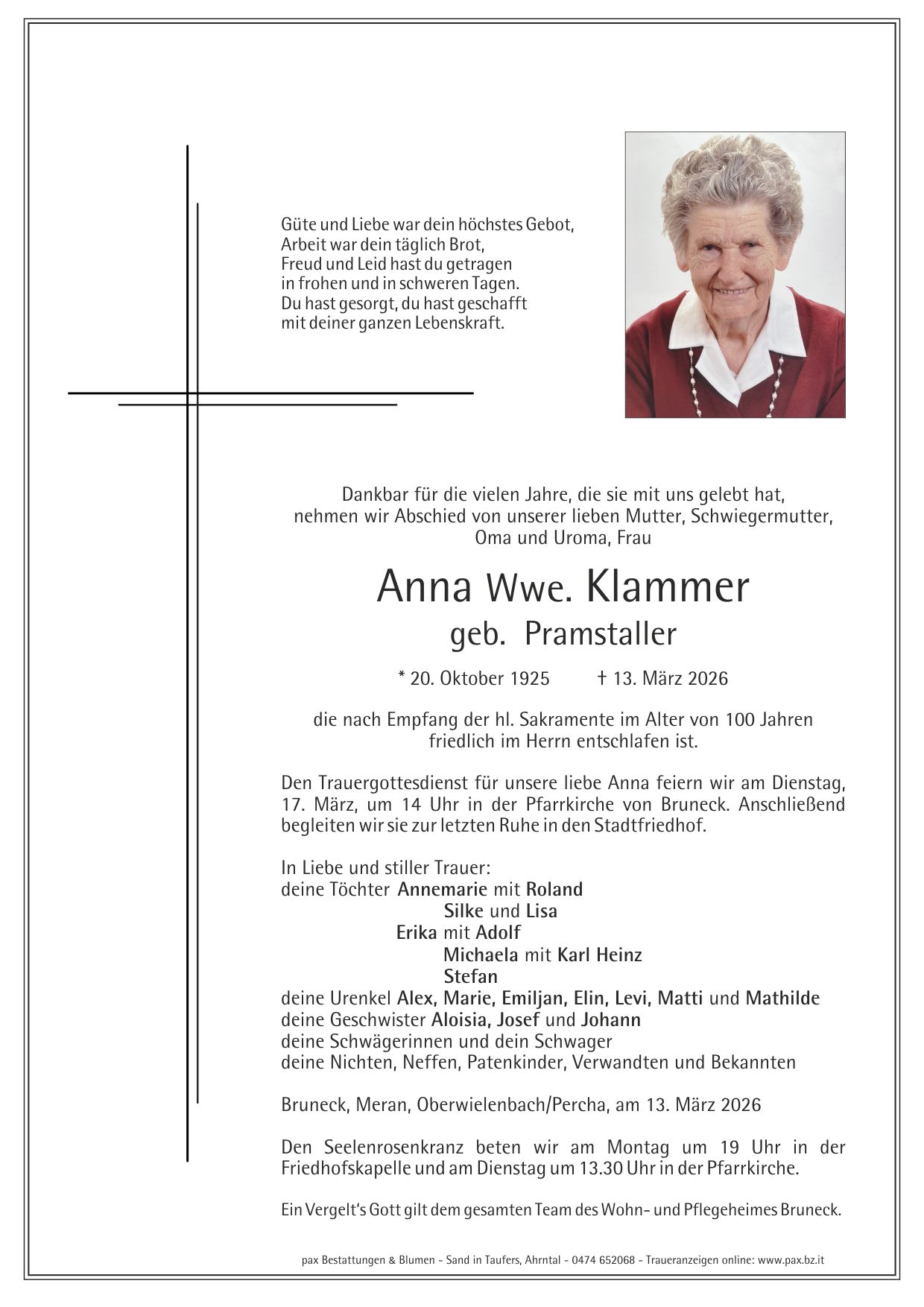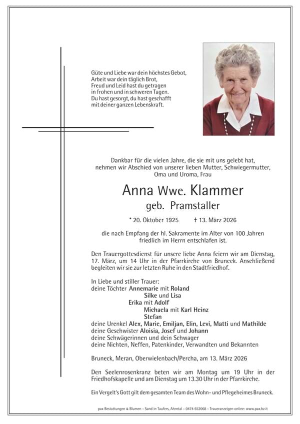 Liebe Nanne, dein Bild verbinde ich mit meinen Kindheitsjahren. Du warst einen herzensgute zufriedene Nachbarin und du hast dein Leben gut gemeistert. Ruhe nun sanft. Deinen Töchtern Annemarie und Erika gilt mein inniges Mitgefühl.